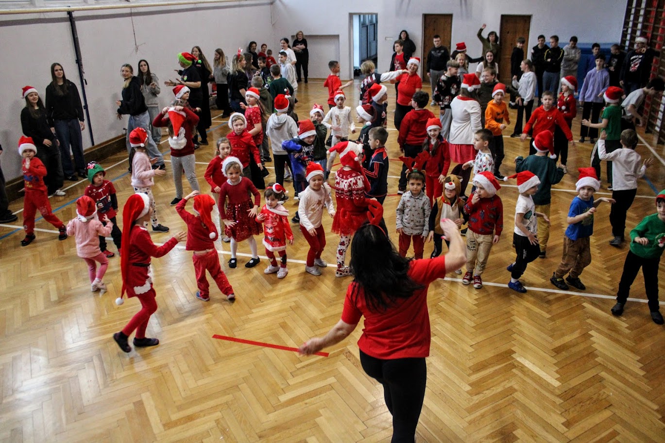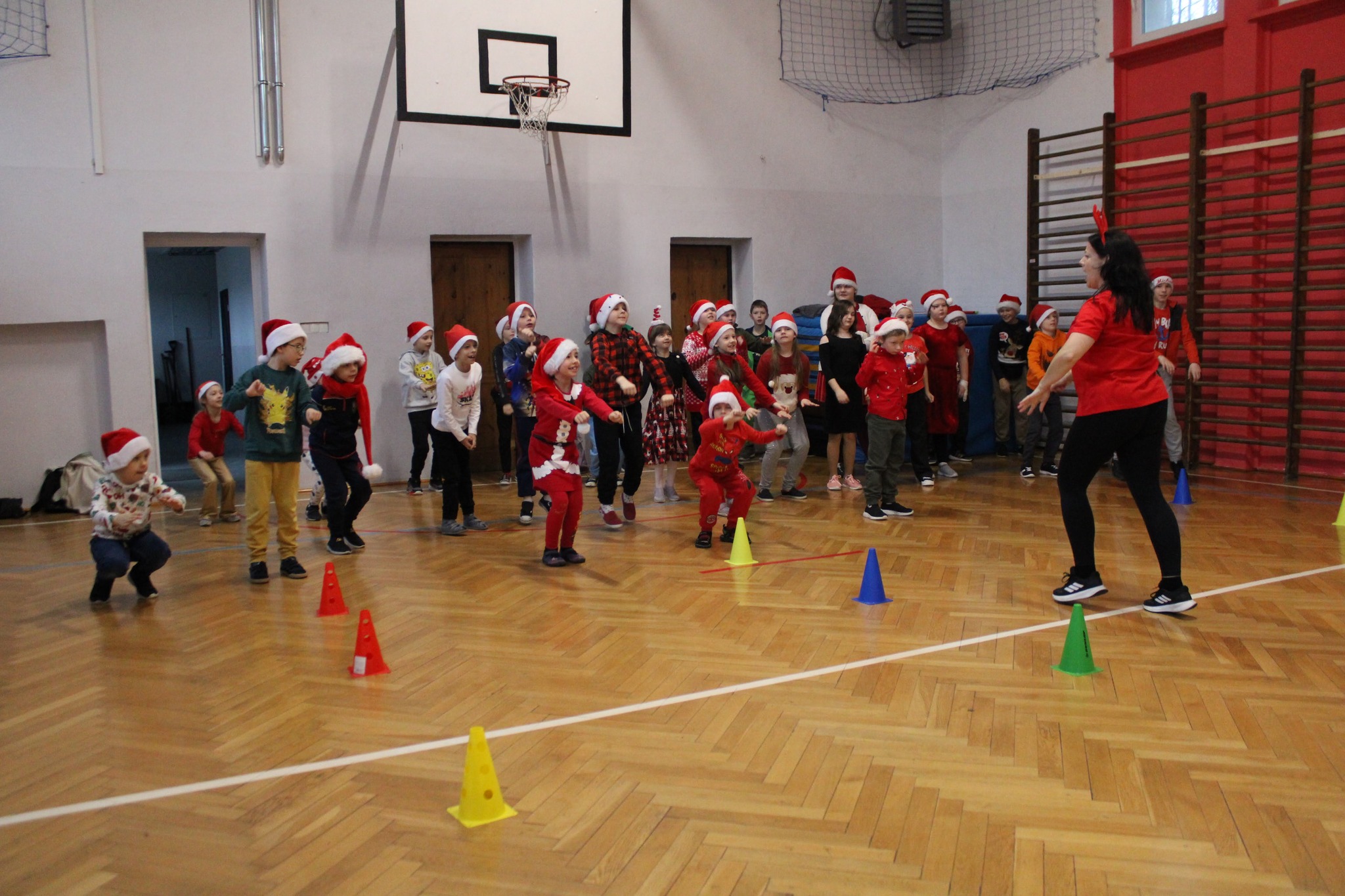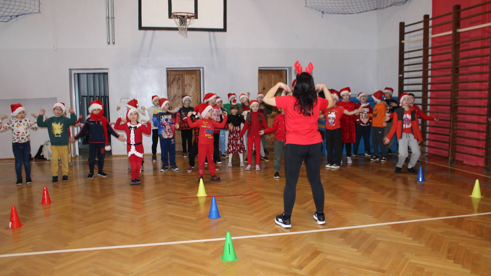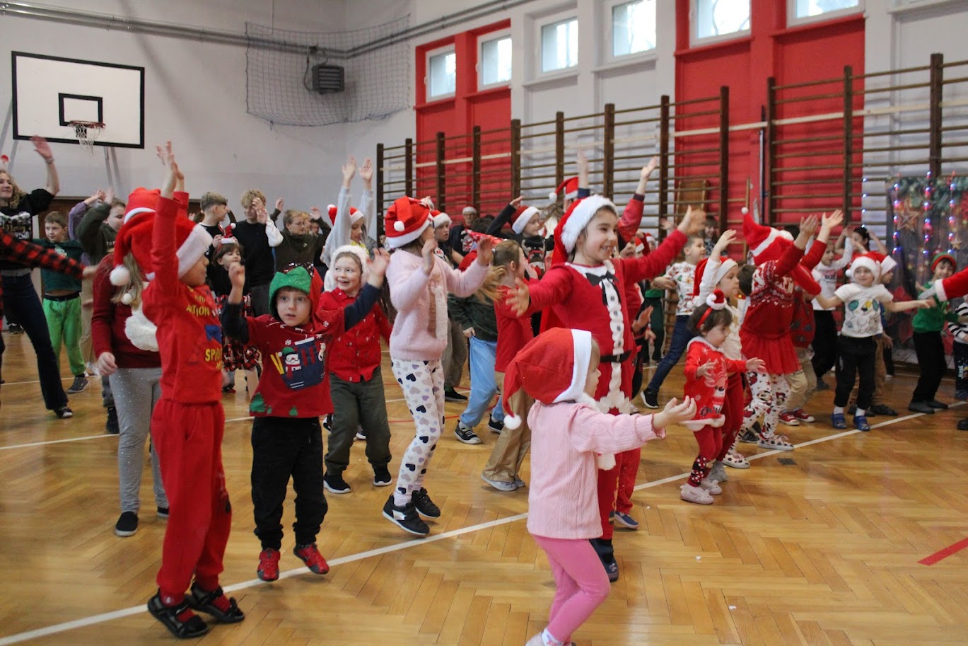 Wszyscy spotkaliśmy się na sali gimnastycznej, aby tam przy muzyce, w ruchu celebrować ten bardzo wesoły i miły dzień. Najpierw maluszki rywalizowały w konkurencjach przygotowanych przez Mały Samorząd prowadzony przez panią Joannę Madej, potem już w całym składzie tańczyliśmy, śpiewaliśmy, bawiliśmy się.