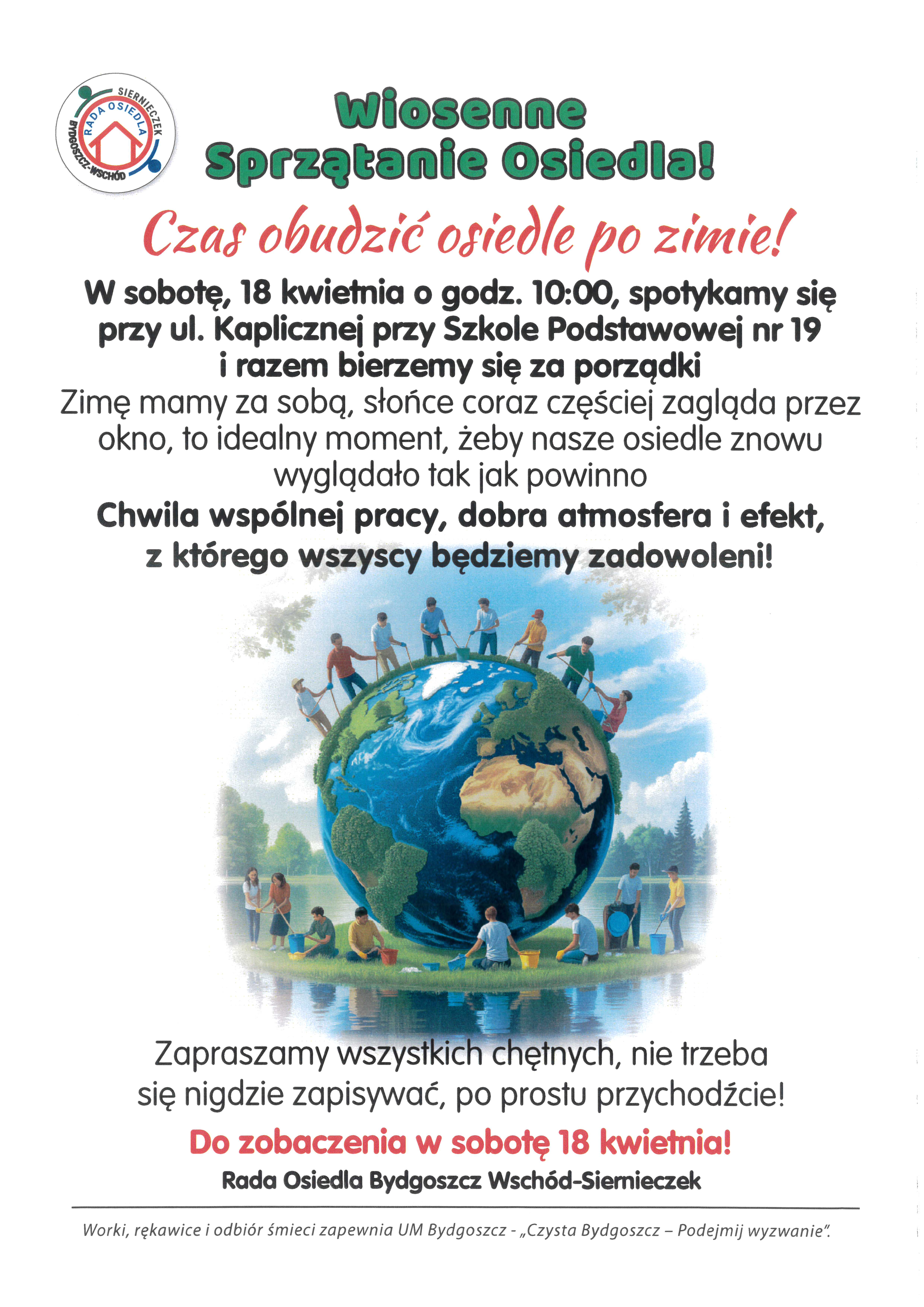 W imieniu Rady Osiedla Bydgoszcz Wschód-Siernieczek serdecznie zapraszamy do przyłączenia się do akcji Wiosennego Sprzątania Osiedla.